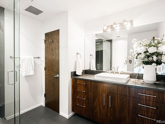 Modern Urban Loft at One Wynkoop Plaza // An upscale downtown residence w/ 3 stunning outdoor balconies sits in the heart of Downtown & McGregor Square. This expansive end unit boasts 2,500+ sq ft of space immersed in natural light w/ 3 beds, 2 baths and 2 flex spaces perfect for an at-home office or gym. Private elevator access opens directly into an entry flex space + onward into a dreamy open dining, living and kitchen area wrapped in gorgeous custom designer finishes. Modern updates & finishes w/ Caesarstone counters, new custom hardwood floors + stainless steel Jenn-Air appliances, a chic kitchen w/ a wraparound counter provides ample space for entertaining. A master suite boasts designer light fixtures, a private outdoor patio, generous closet space + a flexible den area. The en-suite bathroom boasts double vanities, wood accents, a deep soaking tub + walk-in shower. Gorgeous views of Downtown + Coors Field, direct access to McGregor Square amenities + proximity to Union Station, Whole Foods + I-25 create a microcosm of city living. 2 secured parking spaces: 1 interior spaces in garage + 1 exterior reserved space in covered gated lot. Also included is a huge 8ft X 15ft secured storage room. The new hardwood floors are lighter than pictured in photos.