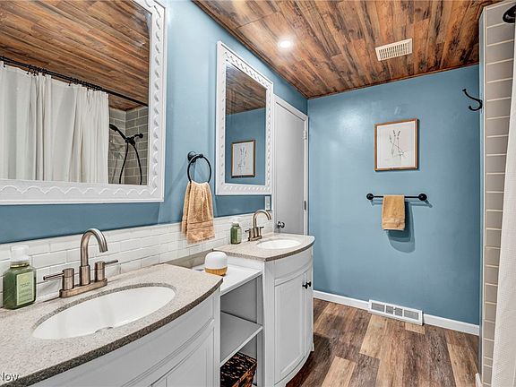 A charming dining area offers a brick accent wall and sliding glass doors that open to a large deck, creating seamless indoor-outdoor living. A full bathroom with vinyl flooring completes the main level.
