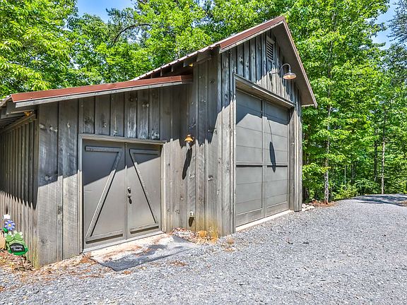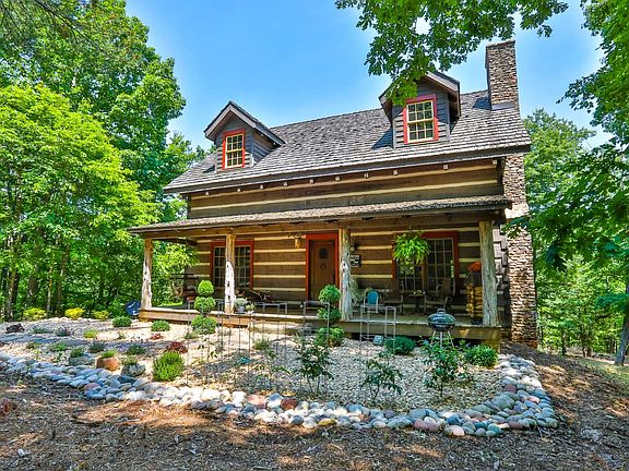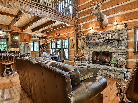 Authentic Hearthstone log cabin at Carters Lake~ Heavily wooded 7.94 ac lot with hiking trails to Carters Lake. Custom and high quality built cabin loaded with rustic charm throughout! Hand hewn beams, heart pine floors, custom log railings, amazing rustic one of a kind shower in master, custom solid hardwood doors, antique vanities custom built with copper and ceramic sinks, and lodge fireplace. 4 bedrooms with master on main and additional sleeping loft can accommodate extra overnight guests. Modern kitchen with custom cherry wood cabinetry, Bosch gas cooktop, granite counters, slate backsplash, and custom farm sink from France. 2022 remodel included finishing basement, new HVAC system, new plumbing, and master bath remodel. Also included is a barn for storage of a boat and 4-wheeler, workout room, which can easily be converted to a party barn for additional entertaining and living space.