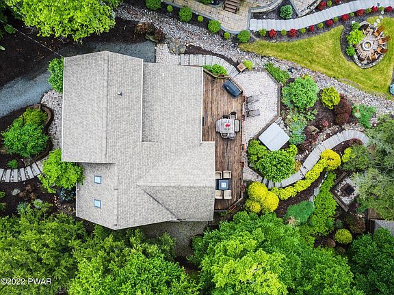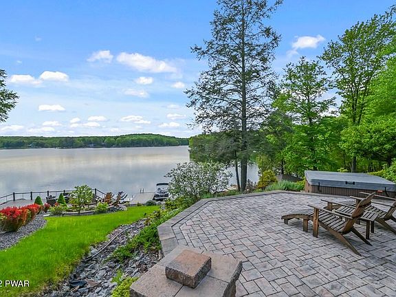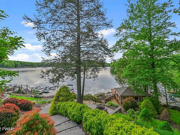 POWERBOATING LAKEFRONT HOME in a four-season amenity filled community in the Northern Poconos, just two hours from the NYC, NJ and Philadelphia Areas. Located on a quiet cove with amazing lake views. This gorgeous home was COMPLETELY RENOVATED WITH QUALITY FINISHES IN 2013 with additions and extensive landscaping. Amazing lakeside space with screened gazebo, large deck, Belgard Paver/Stones in front and rear including steps, walkways and patio with stone wood burning firepit with seating area, beach area, outdoor shower, hot tub, accent lightning in front and rear, shrubbery and trees. The home has three finished levels, an open floor plan, lots of windows offering the best lake views and natural sunlight. Harwood flooring throughout the main and upper levels, custom kitchen with center Island with Thermador Cook'n Vent Down Draft System, beverage cooler, granite counter tops and stone backsplash, under cabinet lighting. 'Hunter Douglas' window treatments on all windows and sliders. The living room has high ceilings, a propane fireplace and custom built-ins. The primary bedroom and bath suite is on the second level along with a spacious loft overlooking the living room. The walk-out lower level has a recreation room and custom wetbar perfect for entertaining, 4th bedroom and bath too! Generac whole-house generator, vector security system, Rinnai tankless hot water heater, HVAC system with central heat and A/C. Two car garage with upper storage area. The Hideout is a four season, Gold Star Gated Community with many amenities and planned activities and 24 Hour Security. There are several lakes which offer boating, fishing and sandy beaches. There are two heated pools, a kiddie pool, numerous tennis courts, basketball courts and ball fields. The golf course has a clubhouse with a full service restaurant and entertainment. There's a recreation center with a well-equipped gym, scheduled fitness classes, a game room with billiard and other table games. There's a woodworking building nearby too. At the main lake, there's a main lodge, a cafe and tiki bar open in the summer, an art center, and a ski hill/tubing area. There are events and activities for all ages! Fourth of July fireworks, and bus trips to casinos, antiquing and NYC. The Hideout has its own water and sewer utility. The Hideout is located about 15 minutes from both Honesdale and Hawley, where there is fine dining, shopping, recreation and medical care. Scranton is approximately 20 minutes away with even more choices, as well as an airport, The Yankees Minor League Team, Montage Mountain with water park and concerts in the summer and a ski resort in the winter.