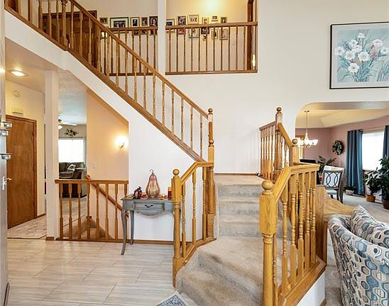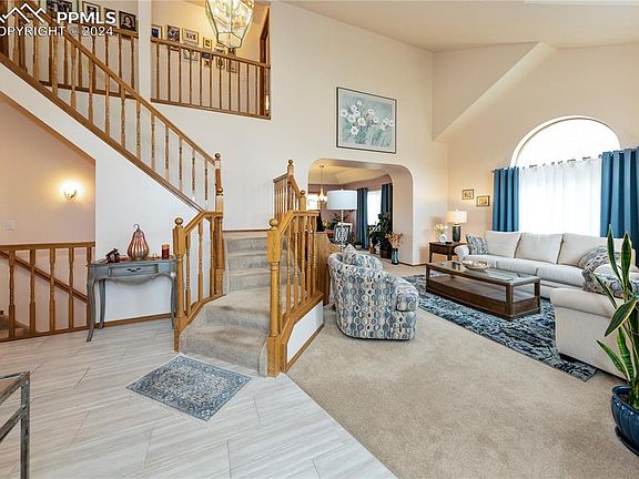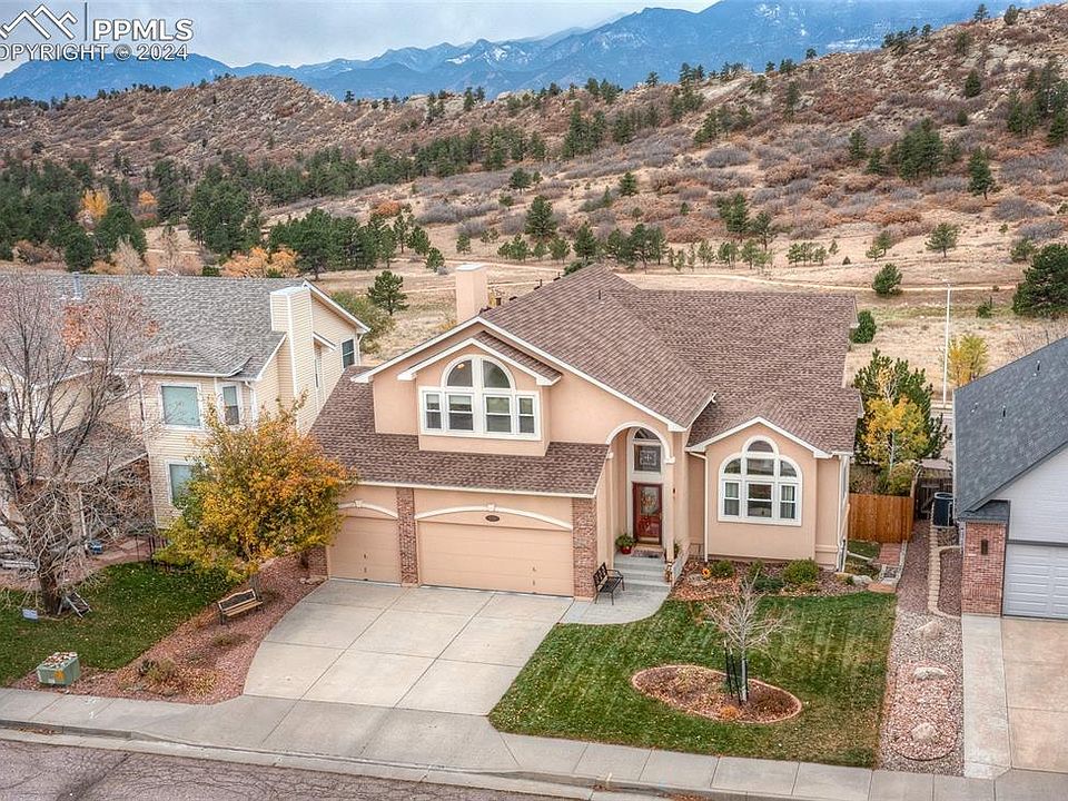 One owner 3944 sq ft 4 bedroom, 2 1/2 bath two story with no rear neighbors & Ute Valley Park, Mountains & Pikes Peak Views. Upgrades include quartz counters in kitchen & all bathrooms, extensive porcelain tile flooring, Anderson Vinyl windows & sliding glass doors. Remodeled baths & stainless steel kitchen with brand new cabinets & quartz counters. Trex deck. Finished & painted 3 car garage ~ Walkout basement~ Game room with pool table~ 2 family rooms ~ Vaulted, Cathedral & Coffered ceilings. Beautiful landscaping with full sprinkler system. Curved stairway in 2 story entry ~ Rough in for 4th bath. Glass french doors. All 4 bedrooms on upper level. Impressive primary suite with large walki-in closet. 5 piece updated bath~ Bay windows~ window seats with storage ~ ceiling fans ~ brick faced gas log fireplace ~ custom book shelves ~ vessel sink ~ 12x7 laundry with full wall of cabinets, pantry, laundry sink & window. Immaculate condition & lovingly maintained inside & out. Other rooms are Game room and L off of family room.