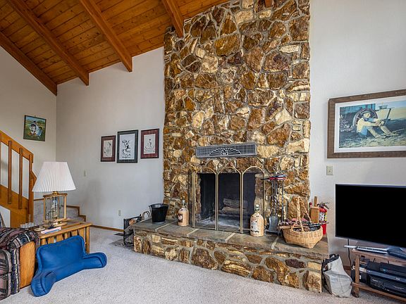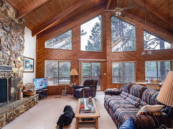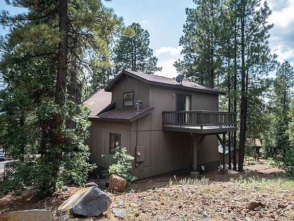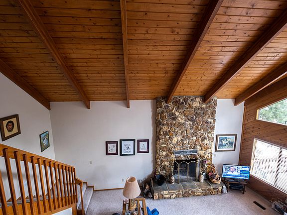 Beautiful well maintained Chalet looking out across an abundance of ponderosa pines. This home is tucked back on a large 11,696 square ft lot. Drive right up to the main level two car garage with plenty of storage and extra space for toys. Up a flight of stairs to the main living area level with a wrap around deck (look at the views) enter the front door and you'll be looking at the large full masonry wood burning fireplace. Expansive wood trimmed windows to enjoy the views. Full kitchen with views to more ponderosa pines, down the hall to the laundry room, full bath and two large guest bedrooms, up the staircase to an extra large, tongue and groove walled loft that looks over the living area with beautiful views out to southeast. Master suite with its own balcony, walk in