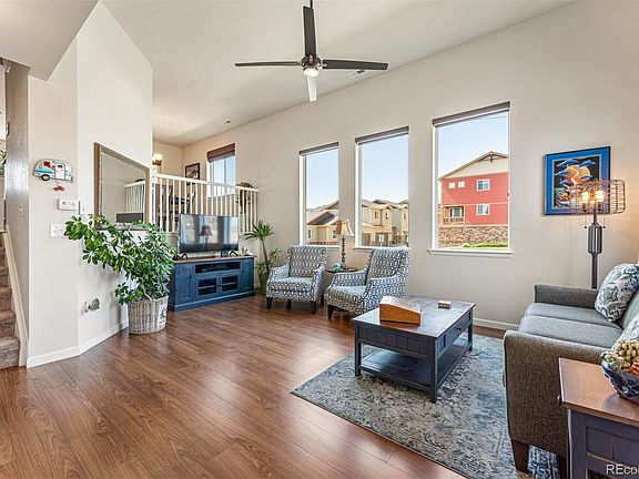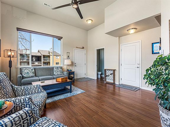 Modern, end-unit townhome - low maintenance, lovingly maintained and still feels like new. This one is work a look! The highly livable design of this two-bed, three-bath home starts on the main floor. Here, you'll appreciate designated areas and levels to create separate spaces while still enjoying clear sight-lines and a seamless flow. The spacious living room has high ceilings and large windows that welcome ample natural light. There’s also a convenient half-bath for guests. The updated kitchen includes an island, granite counters and stainless appliances. Lovely south-facing balcony and deluxe touches like custom window shades throughout. Upstairs, there are two bedrooms, each with its own ensuite bath and walk-in closet. There's also a loft space, great for an office or craft area, and the laundry for ease. The attached, epoxy floor coated two-car garage has a large crawlspace that's perfect for all your storage needs. The community includes a dog park and playground, and is located next to a grocery store, restaurants and shops. Quick access to I-25 makes commuting a breeze.