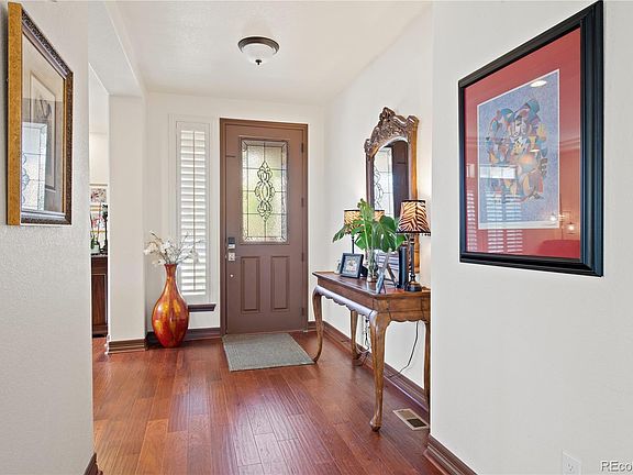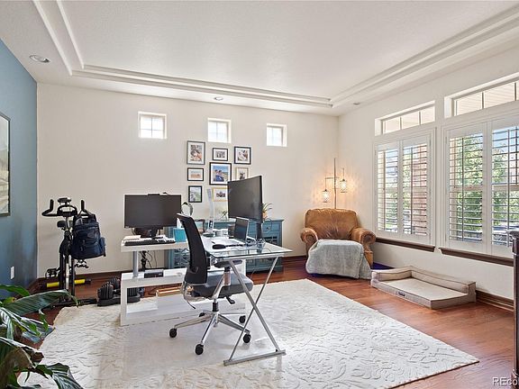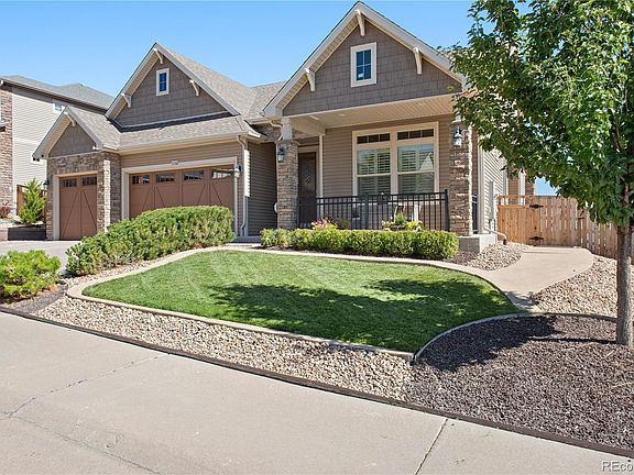 Come see your Dream Home today located in The Meadows of Castle Rock. This absolutely stunning ranch home offers an expansive loft 4 bedrooms, 4 baths plus a main floor office. This dream house comes with 3 primary bedrooms, one on each level, with 4/5-piece bathrooms and walk-in closets. Upon entering, you will notice the updated main level, including attractive engineered hardwood flooring with a hard scraped hickory texture throughout. Open concept, with a gourmet kitchen with expansive granite island and All New stainless-steel appliances replaced 2023: Thor dishwasher, KitchenAid refrigerator, Induction Range. Enjoy the custom shutters throughout the main floor windows, that allow full opening to the views of the valley and blue skies. There's a finished basement with walk-out to the outdoor entertainment fire pit area. The backyard includes low maintenance turf and is fully fenced. Enjoy the skies on the upper and lower patios as well. This home is 1 block from Bison Park and a trail head to a Ridgeline open space and trails. 5 minutes to local shopping, restaurants and The Outlets Mall.