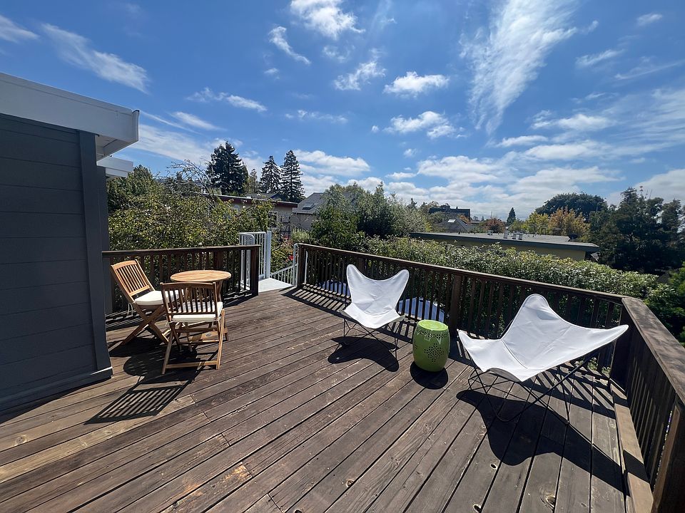 This is an upstairs in-law unit that is a studio apartment. It's at the back of a beautiful North Berkeley Home. It includes a large private deck and includes ALL utilities. Great location! 5 blocks to BART, 10 blocks to UC Berkeley and walking distance to great restaurants and shopping. The studio is filled with natural light and has hardwood floors. It's 400sq ft with a wall dividing the kitchen from the living space. The bathroom is fully updated with a beautifully tiled shower with glass wall. There is a new mini-split which provides both heat and air conditioning. The kitchen is fully stocked with all the needed pots and pans, silverware plates etc. There is a queen size bed but you'll need to provide your own sheets and towels. There is no washer and dryer. There's Bing Wong cleaners on Shattuck Ave, about 7 blocks away. You access the apartment through the side gate which is securely locked at all times. The backyard is fully landscaped with dining table and outdoor heater and evening lights. The backyard space is shared with the tenants in the main house (a young couple with a 7yr old daughter). No Pets allowed. NO SMOKING! Owner pays all utilities. The lease is through June 15th. Possibility of renewal. No pets allowed. No laundry.