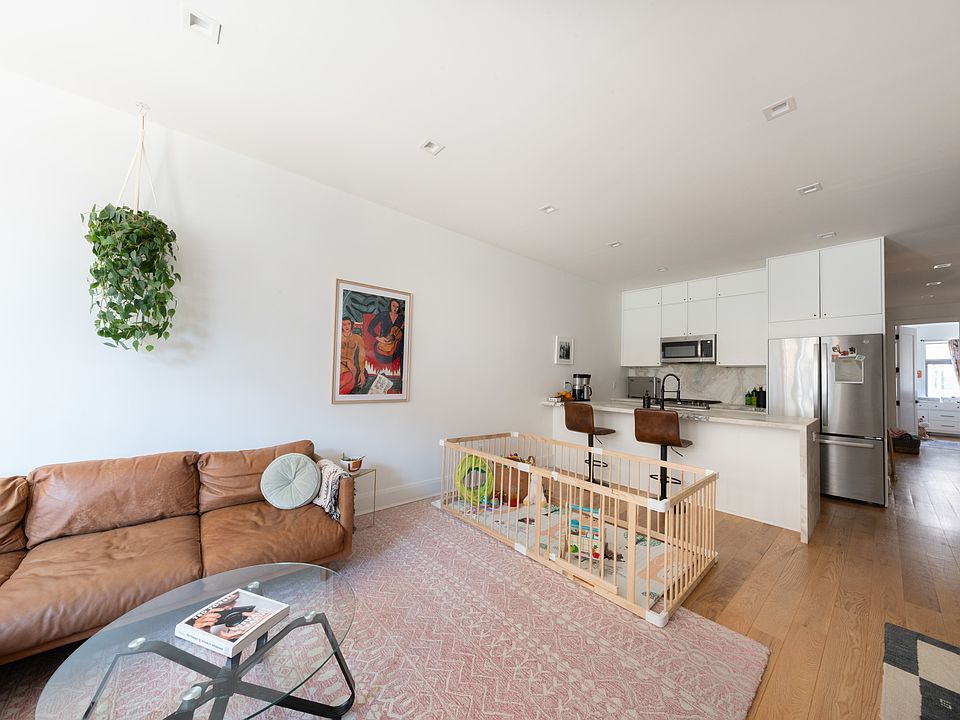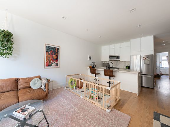 Spacious and beautiful 2-bed, 2.5-bath condo is available for the first time in charming Ridgewood. This nearly 1700 sq ft duplex offers an elevated quality of life with modern amenities while keeping you housed in a timeless barreled brick townhouse. You are welcomed into a spacious living room that is lit by 3 beautiful windows from the front of the house. The abundant living room size allows for a grand living room spread or you can easily add a zone for a sitting area perfect where guests can sit whilst you entertain from the kitchen. This open chef's kitchen features an oversized quartzite island and a GE appliance package, including a stainless-steel dishwasher, a dual-door refrigerator, and a five-burner gas range. Ample storage and counter space is hearty. Perfect for entertaining, this spacious kitchen seamlessly flows into the adjacent dining area, which accommodates a large table without compromising the living room space. Both bedrooms are situated at the back of the home, offering abundant natural light and tranquility. The primary bedroom boasts a large triple-bay window with a cozy sitting area and easily accommodates a king-size bed with additional furniture. A walk-in closet leads to the en-suite bathroom, which is elegantly tiled with blue vertical stack bond tiles and features a double vanity, built-in medicine cabinets, and radiant heat flooring. The secondary bedroom fits a queen-size bed and offers direct access to the private backyard. The adjacent bathroom features a beautifully skirted tub and sophisticated tiling throughout. The lower level is a generous bonus room that serves as a functional extension of the home. This windowed space also provides direct backyard access. The level includes a half bath, a full-size gas washer and dryer, and ample storage. Currently configured as a gym, home office, and TV room, this versatile space can be adapted to suit your lifestyle needswhether for entertainment, work, or relaxation. The nearly 750-square-foot private backyard is an exclusive retreat, perfect for the warmer months ahead. Enjoy al fresco dining, grilling, and hosting friends under the pergola. Ideally located in the neighborhood, this home offers convenience while maintaining a peaceful atmosphere. It's just minutes from the Myrtle/Wyckoff and Seneca Avenue M train stations and a short distance from the Halsey L train. Essentials such as pharmacies, grocers, and the post office are close by, along with local favorites like Evil Twin Brewing, Trans Pecos, TV Eye, Rudy's, Deep Cuts Record Store, Topos TOO, Norma's Corner Shoppe, Rolo's, and Il Giganteall just minutes away. Welcome Home.