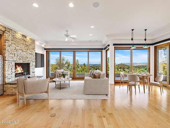 Discover a one-of-a-kind custom Luxury Home in the exclusive Hassayampa Gated Golf Community. Nestled among the pinon pines, this stunning mountain retreat offers breathtaking panoramic views stretching from Thumb Butte, City Lights to the San Francisco Peaks.INCLUDED in the price is the Adjacent Lot .27 acres, providing additional privacy or expansion opportunities. Home Designed for main-level living, featuring a spacious Primary Suite with a Dual Spa-like Bath and Walk-in Closets, inviting Family Room, Wine Cave, and elegant Dining Room, all centered around a Chef's Kitchen complete with Butlers Pantry. Expansive windows flood the interior with natural light and frame the spectacular views, while multiple decks create the perfect setting for outdoor entertaining.