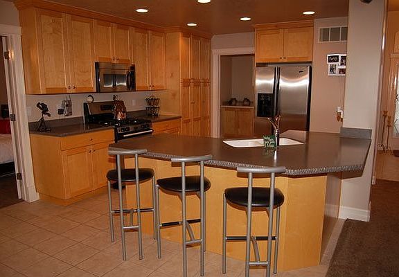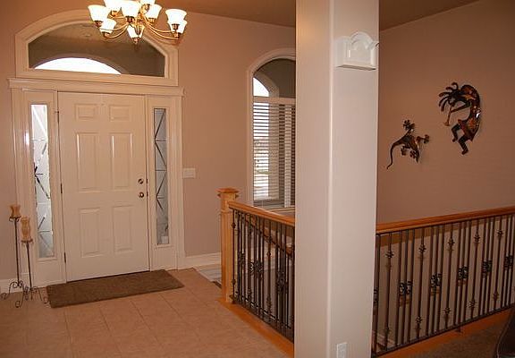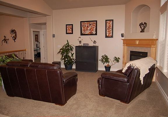 Almost perfect! INSIDE:Maple cabinets,Corian countertops w/rock chip edge&integrated sink,stainless steel appliances,gas range,tile floors,gas fireplace w/mantle,wired for surround sound. AND OUT:Full vinyl fence,open&covered patios,waterfall&pond,RV pad.