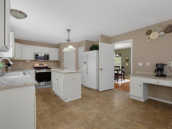 Gorgeous 4 bedroom, 2.5 bath 2-story home in sought-after Hilltop Village! Inviting entry opens to formal living or dining room space with gorgeous hardwood floors. Hardwoods continue to the family room which boasts a fireplace, new lighting (2024) and large bay window overlooking the rear yard. The updated kitchen features white cabinetry, new granite countertops (2024), a center island, walk-in pantry and stainless steel appliances. A spacious laundry room and powder room complete the main floor. Upstairs, find nicely-sized bedrooms, all with LVP flooring and neutral paint. The primary suite has a vaulted sleeping area, walk-in closet and en suite bath with separate shower and jetted tub. An additional full bath serves the remaining three bedrooms. The finished lower level includes a large rec space, perfect for a play space or additional living area. Relax outside on the oversized rear patio and enjoy views of your private backyard backing to trees! Award-Winning Rockwood schools!