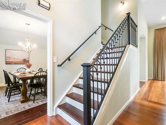 Nestled on a peaceful .73 acre lot in desirable Woodmoor, this beautifully updated 4 bedroom, 4 bath home offers privacy, natural beauty, and spacious living. Mature trees, striking rock formations, and a gently sloping southern landscape create a serene setting that attracts local wildlife, including deer and great horned owls. Step inside and immediately enjoy picturesque views of the lush backyard, featuring a professionally landscaped stone waterfall and beautiful composite deck. The heart of the home is the inviting central living room, complete with soaring vaulted ceilings, abundant natural light, custom built-ins, and a stone gas fireplace. The kitchen is designed for both functionality and style, with an eat in dining area, island with breakfast bar, stainless steel appliances, and designer glass tile backsplash. A flexible main level bedroom can easily serve as a home office or guest suite. The main floor also includes a bright formal dining room, laundry area, and convenient half bath. Upstairs, the spacious primary suite offers a peaceful retreat with a private balcony overlooking the trees and rock formations, a walk in closet, AC split unit, and a luxurious 5-piece ensuite bath. Two additional upper-level bedrooms and a full bath provide ample space for family or guests. The basement level features a finished half bath and offers a blank canvas for customization whether you envision a home gym, entertainment space, or additional living quarters. Outdoor living is equally inviting, with multiple patios tucked against the hillside to provide privacy and stunning natural views. This rare combination of distinctive topography, generous lot size, and thoughtful updates makes this home a true Woodmoor gem.