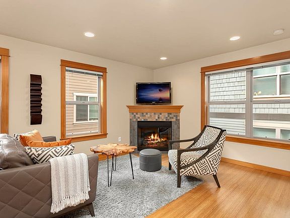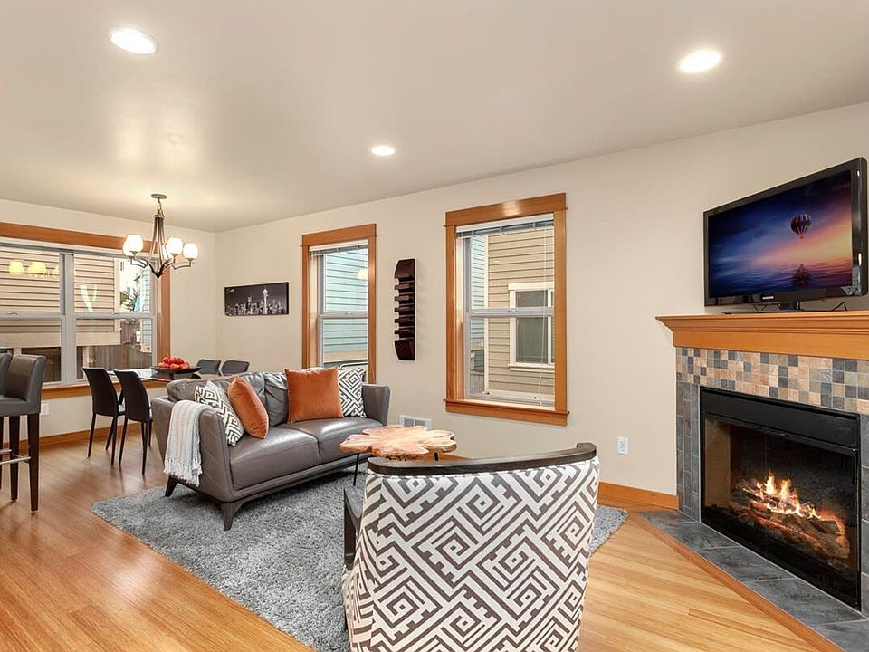 Welcome to this modern 3-story townhouse built in 2009, featuring a fenced back patio and a secured parking space. Located in North Beacon Hill, this home offers easy access to Downtown Seattle with an 8-minute drive or a 12-minute walk to the Beacon Hill Light Rail station. Enjoy the convenience of nearby amenities, including a public park with a playground, tennis court, and basketball court just across the street, as well as a grocery store, brewpub, cafes, and restaurants within a 10-minute walk. The first level of this townhouse offers a versatile living room with a comfortable sofa, smart TV, stylish coffee tables, reading lights, and a dedicated working desk with an office chair. From here, you can access the private patio and backyard, perfect for family gatherings. The second level features another living room with a comfortable sofa, smart TV, board games, and a fireplace. The open-plan fully equipped kitchen includes a complete coffee set-up with three brewing options, state-of-the-art cooking amenities, and spacious granite countertops. Enjoy meals at the dining table with seating for six, while taking in the neighborhood view. The third level houses two bedrooms with queen-size beds and a second dedicated desk with an office chair, along with a laundry space equipped with a washer and dryer. Guests can enjoy one free parking spot and additional free street parking. For those who prefer not to drive, convenient transportation options include car rentals, taxis, and ride-sharing services like Lyft and Uber. Situated in a primarily residential area, this townhouse is within walking distance to a grocery store, brewpub, cafes, restaurants, and the Beacon Hill Light Rail station. A public park with a playground, tennis courts, and a basketball court is directly across the street, making it an ideal location for families and sports enthusiasts. The proximity to public transit allows for easy access to Mariners and Seahawks games, as well as other Seattle attractions. This townhouse is not handicap-friendly, with 5 steps from the street and stairs connecting the three stories. It features a portable AC unit on the first floor and two window ACs on the third floor, with tower fans in the living room. Smoking and vaping are strictly prohibited inside the house, with violations resulting in a minimum fine of $500. Quiet hours are after 9pm, and any form of noisy gathering is strictly prohibited. Violations may lead to immediate cancellation of the reservation. The townhouse features a dedicated working desk with an office chair on the first level and a second desk with an office chair in one of the third-level bedrooms, providing a comfortable remote work-friendly environment. A laptop computer is not included.