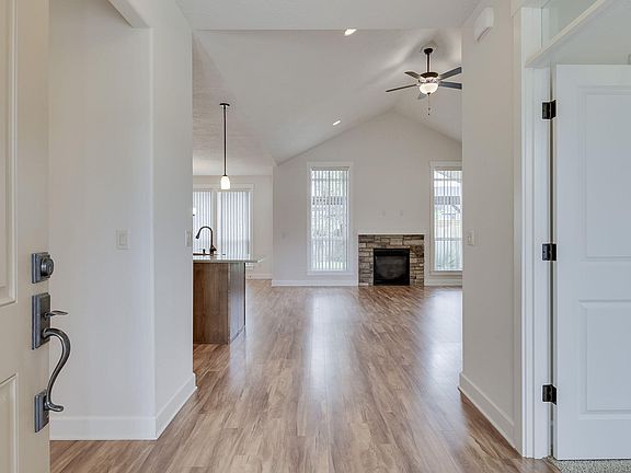 - Breakfast Bar, Ceiling Fan(s), Double Vanity, Fiberglass Stall Shower, Granite Counters, Kitchen Island, Linen Closet, Open Floorplan, Pantry, Primary Downstairs, Shower/Tub Combo, Soaking Tub, Solid Surface Counters, Vaulted Ceiling(s), Walk-In Closet(s)