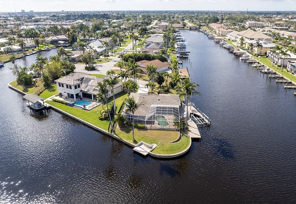 Welcome to your dream waterfront retreat in Cape Coral, FL! This exceptional Gulf-access home is situated on a prime point lot with an incredible 267 feet of frontage on intersecting 200+ ft canals—offering breathtaking panoramic water views from every angle. Experience the allure of abundant marine life, including frequent sightings of dolphins and schools of tarpon right behind the house. With only two turns to the river, this location is a boater’s paradise, providing direct Gulf access with no bridges for the ultimate Southwest Florida lifestyle. Step inside to discover an open, inviting layout with expansive windows showcasing the stunning waterfront vistas. The outdoor space is an entertainer’s dream, featuring a spacious lanai, a custom pool and spa, and a wraparound seawall with plenty of dock space for your boat, jet skis, and more. Enjoy unforgettable sunsets and endless water views from your private oasis, where the serene waterfront setting offers peace and tranquility. Situated in one of Cape Coral’s most sought-after neighborhoods, this home is just minutes from fine dining, shopping, and world-class fishing and boating. Whether you're looking for a luxurious full-time residence or a vacation escape, this rare waterfront gem is a must-see! Don't miss this opportunity to own one of Cape Coral’s most desirable point lots—schedule your private showing today!