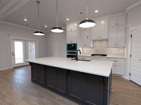 This Shiloh Bonus Room floorplan includes 2,805 Sqft of total living space, which features 2,450 Sqft of indoor living space & 355 Sqft of outdoor living space. There is also a 610 Sqft, three-car garage with a storm shelter installed because, at Homes by Taber, safety is never an option. This defining home offers 4 bedrooms, 3 bathrooms, 2 covered patios, & a large bonus room! The spacious living room features a stunning coffered ceiling, a stacked stone surround center gas fireplace, wood-look tile, elegant crown molding, large windows, Cat6 wiring, & a barndoor. The high-end kitchen supports custom-built cabinets to the ceiling, impressive tile backsplash, built-in stainless steel appliances, a center island with a trash can pullout, impeccable pendant lighting, a walk-in pantry, & 3 CM countertops. The primary suite offers a sloped ceiling detail, windows, a ceiling fan, our cozy carpet finish, & 2 separate walk-in closets. The attached primary bath features separate vanities, a corner Jetta Whirlpool tub, a private water closet, & a huge walk-in shower! Property is fully sodded with an in-ground sprinkler system in both yards! The covered back patio offers perfection with its wood-burning fireplace, gas line, & TV hookup. Other amenities include Healthy Home technology, a tankless water heater, a whole home air filtration system, R-44 Insulation, & more!