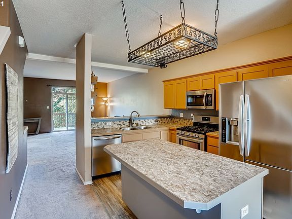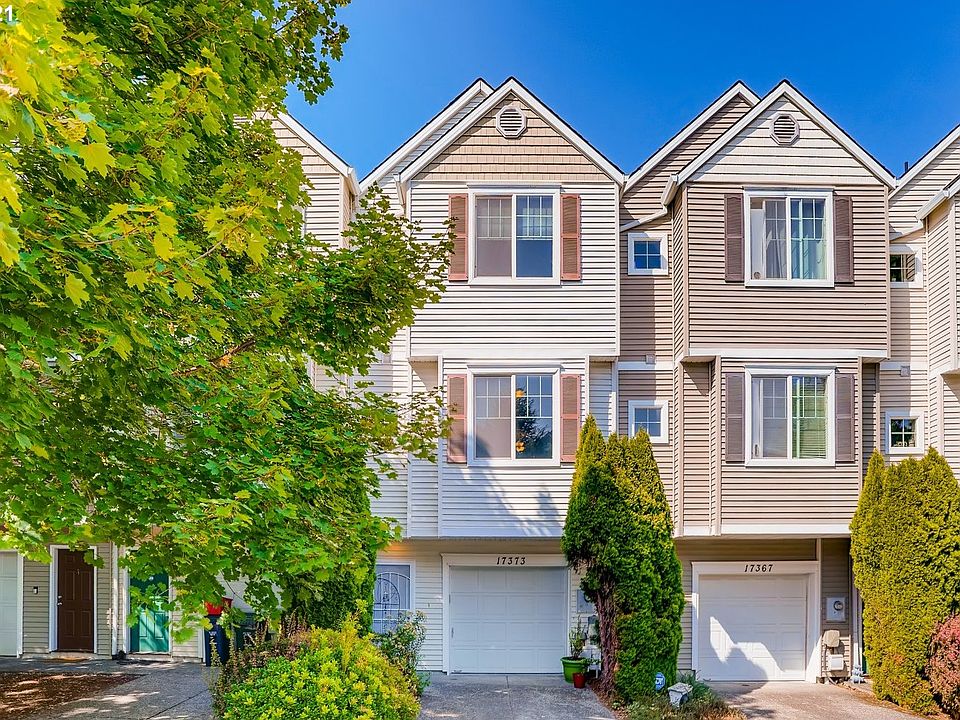 Wonderful townhome with rare privacy.Oversized finished tandem garage with limitless potential.Warm inviting custom paint with wide open floor plan.Fireplace,eat bar,updated kitchen with stainless appliances,island and pantry.Dining room.High ceilings. Slider to deck overlooking mature apple, plum and cherry trees. Fenced backyard.Dual bedroom suites with laundry upstairs. Walk-in closet. A/C.Convenient location near the bus,Champions Park,hiking,biking trails,gym & restaurants.