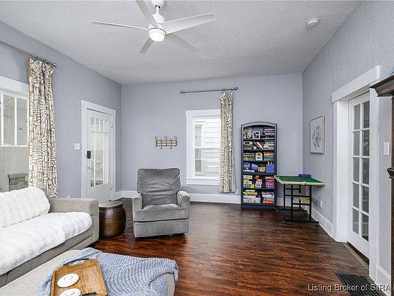 Spacious home in desirable Uptown New Albany just a short walk to local shops, parks, and schools! This 3-bedroom, 1-bath home was remodeled four years ago and has recently been refreshed with several thoughtful updates. The foundation has been professionally repaired, and the interior features new butcher block countertops, added cabinet hardware, a built-in dishwasher, garbage disposal, updated lighting and ceiling fans throughout. The bathroom now includes a larger vanity and ceramic tile flooring. Enjoy 10-foot ceilings, an enclosed front porch, fenced backyard, and a 2-car garage. Major systems including HVAC, roof, ductwork, water lines, and appliances were all replaced five years ago. Sq ft & rm sz approx.