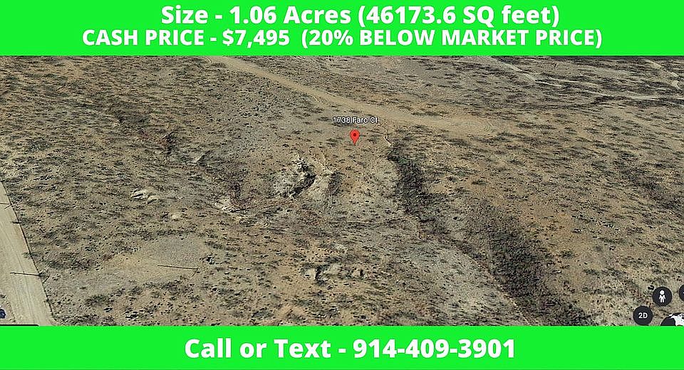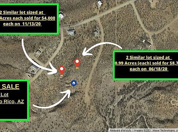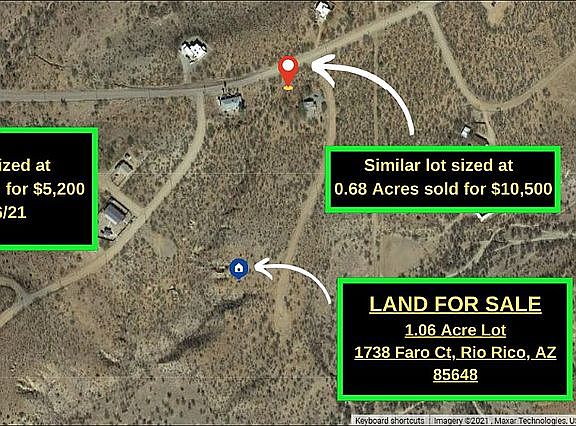 Premium 1.06 Acres in Rio Rico, Arizona Comparable Sales are $10,000 & Up! BUY TODAY FOR 25% Below Market Price For $7,495! Very Motivated Seller! Premium lot on County Maintained Road with Water and Electricity on The Road. Come and build your ideal home in the historic town of Rio Rico, Arizona or hook your RV up and watch the sun go down every evening in the beautiful Arizona desert. *52 Minutes away from Tucson AZ *20 Minutes to Mexican Border *2.4 Hours away from Pheonix AZ *2.4 Hours from Scottsdale AZ *24 Minutes to Walmart Superstore Many Amazing Local Attractions Just Minutes Away: Restaurant La Bocanita Tumacacori National Historic Park Southwest Parks & Monuments New Mexico & Arizona Railroad Hiking Trail Sonoita Creek State Natural Area Patagonia Lake Reserve Recent Comparable Sales: 76 Calle Agua Salada, Rio Rico, AZ 85648 (0.51 Acres) Sold for $5,200 on 01/06/21 (2 Lots) 1715 Nieve Ct Rio Rico, AZ 85648 (0.53 Acres each) sold for $4,000 (each) on 11/13/20 (2 Lots) 1736-Faro-Ct-55-Rio-Rico-AZ-85648 (0.99 Acres each) sold for $8,700 (each) on 06/18/20 Buy This Property Today for 20% Below Market Value – Instant Equity! Own it Today For Just $7,495 Property Type: Land State: AZ County: Santa Cruz APN (Assessor's Parcel Number): 10921247 Property Address: 1738 Faro Ct, Rio Rico, AZ 85648 City: Rio Rico Zip: 85648 Size: 1.06 Acre(s) Road Access: Yes Annual Taxes: $112