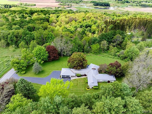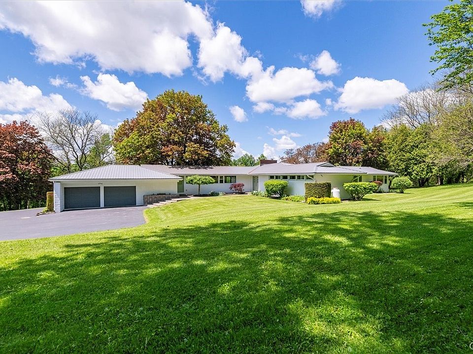 Welcome to this exquisite mid-century modern home thoughtfully designed by renowned architect Arthur Meggett. Nestled just outside the charming village, this property offers a serene escape in a park-like setting while being only minutes away from Colgate's campus. In 2016-18, the house was restored and renovated from roof to basement. The inviting floor plan seamlessly integrates the living, dining, and kitchen areas, perfect for modern living and entertaining. The large kitchen is a chef's delight, featuring a Viking 6-burner gas range, concrete counter tops, sleek custom alder cabinetry and a walk-in pantry. Expansive windows in the living room frame breathtaking views of the surrounding natural beauty, flooding the space with natural light. A double-sided gas fireplace is shared by the living room and cozy den. This home has five generously sized bedrooms along with five full baths designed with luxurious finishes (3 with steam showers). Entertain guests outdoors on the deck, overlooking the sprawling 5-acre property that provides peace and tranquility. Experience the perfect blend of modern luxury, timeless design, and natural beauty in this mid-century modern masterpiece.