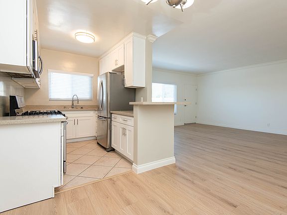 This spacious completely renovated 1-bedroom 1-bath offers 730 sq. ft. of living space! Upon entering, you'll be greeted by beautiful laminate flooring, crown molding and custom color accent walls. The living and dining area feature double pane windows that bring in lots of natural light and minimize outside noise. The modern kitchen boasts stainless steel appliances, quartz countertops, and ample cabinet space. As you enter the hallway, there is a separate dressing area with mirrored closet doors and linen cabinets conveniently located just outside the bathroom. The spacious bedroom includes wall-to-wall mirrored closets, a double-paned window, and a wall A/C unit. The updated bath features a quartz vanity, designer framed mirror, and a full tub/shower combo. Don't miss out on this fantastic home!
