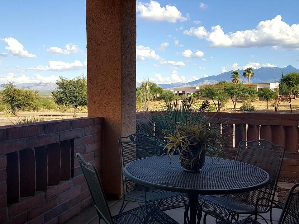 High ceilings, split bedrooms and panoramic mountain views come with this End unit in Cortina Villas. Move right in or rent right out. Great rental history. Jan, Feb, Mar @ $2300-$2400 per month. Move in ready and fully furnished .This 2 bedroom townhome has 1 bedroom which has its own entrance or lock-out suite for guests or family. Great location close to a Green Valley Recreation center and golfing. Santa Rita roof warranty thru June 2018,Termite warranty with Bills Home Service thru July 2018.Green Valley Heating & cooling contract thru Dec 2017. Pest control with Bugs R Us, Exterior paint cycle included in HOA Dues 1 car carport parking