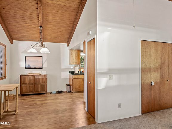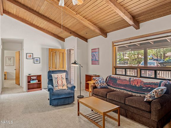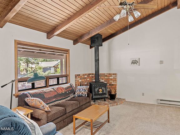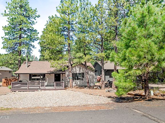 REDUCED $80,000! You must see this quiet, peaceful home in the cool Mt. Pines. It has a great cabin feel with its vaulted tongue-n-groove ceilings & wood stove. Barely lived in & meticulously cared for it feels almost new w recent upgrades including: Rebuilt TREX large front & back decks. Wood vinyl flooring & luxury carpeting. Gorgeous, tiled Quartz countertops w stainless stove, microwave & sink. Extended tile shower. Newer washer, dryer & outside grill. Roof, water heater & vinyl siding have all recently been replaced too. Move in ready including all exterior furniture, most interior furniture, all dishes, linens and appliances. Perfect primary, 2nd or vacation home as short-term rentals allowed. Munds Park amenities include Golf, swimming, tennis, club house, playground & restaurant