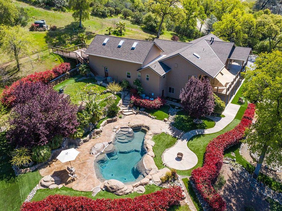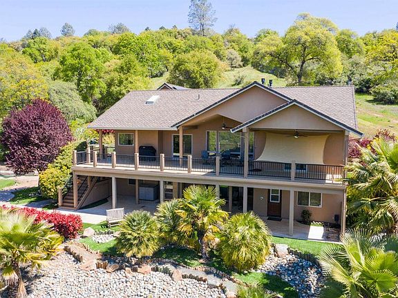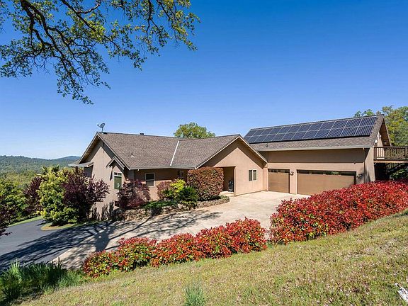 Custom 3855 sf 4 bed 4 bath home plus 760 sf Finished Bonus room on 10 acres with simulated rock saltwater pool~Beveled glass entry doors open to a lg open floor plan that offers Chef's kitchen w/island & 2nd sink~skylight~FiveStar 6 burner gas range~compactor~ wine cooler~ fossil limestone counters~walnut cabinets & large walk-in pantry~Large windows & new deck offer spectacular views & sunsets! Large Master walk-in closet~dbl sinks~dbl head shower & jetted tub in travertine. Office w/beveled glass doors. Laundry room w/many cabinets & deep sink. Dwnstrs living room separates the master suite w/walk-in closet~lg bath~laundry & kitchen from 2 more bdrms & bath. Home has a Whl/hse fan,HVAC, Surround Sound & Whl/hse speaker sys & 800+ sf bonus/game room. Backyard has fruit trees & raised garden beds~Irrigated west facing slope w/NID creek provide cascading waterfalls & miners inch for potential vineyard.Solar panels eliminate electric bills & Kohler generator allows for backup power