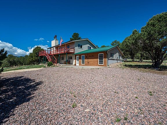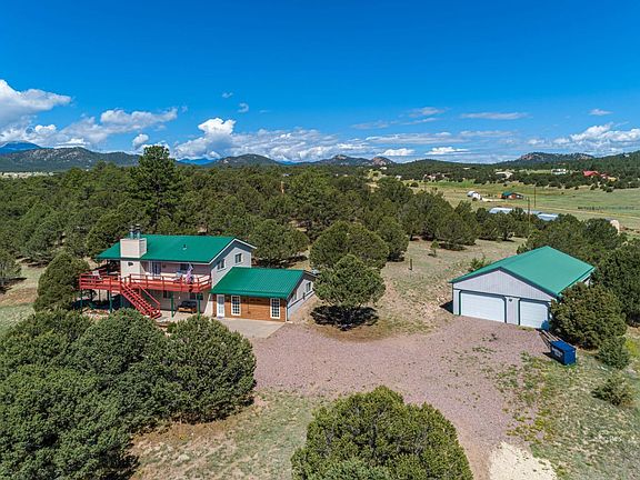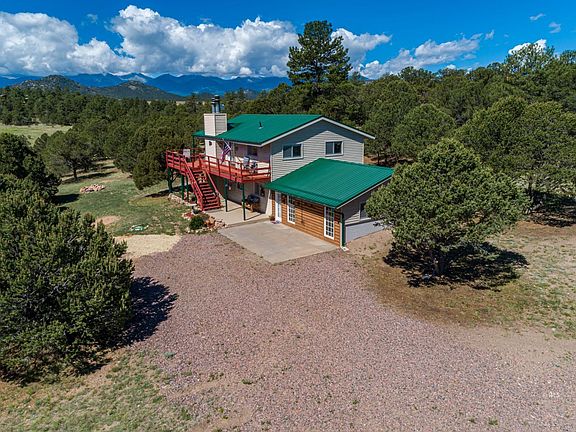 Sangre de Cristo AND Wet Mountain Range Views, many Trees to include large Ponderosa Pines, and Meadows of wild flowers all found on this fully fenced, manicured 15 acre horse property. Enclosed Chicken Coop, 10x12 Tack Shed, 20x15 Barn or Hay Storage w/electric AND 30x50 Metal Building w/electric and insulation allow plenty of room for all your toys and hobbies. This well maintained, stick built raised rancher w/walkout lower level is fully finished with many amenities to include Private, Primary or in-Law Suite w/sitting room and wood stove. The HUGE great room w/gas stove has room for a game area and big screen TV. Walk out to the covered patio and enjoy the covered wrap around deck, too. Warm wood flooring, vaulted ceilings, large windows, and new appliances make this home move in ready. No Covenants or HOA. BTW, some of the furniture stays, too.