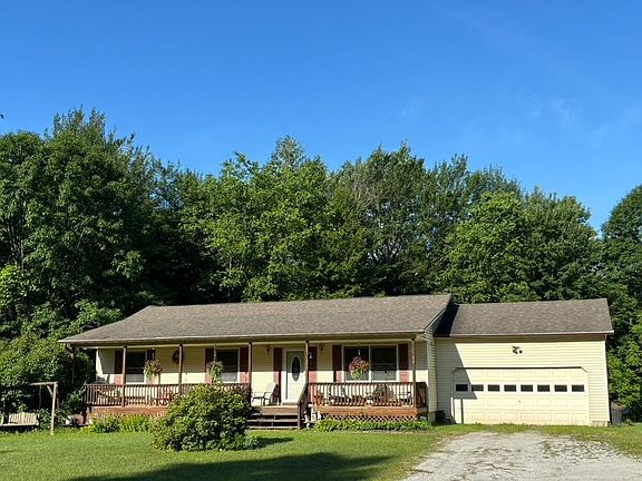 Welcome to this beautiful 1.33 Acre country lot holding this ranch style home with full basement and attached garage. Relax on the full front covered porch lined with perennial beds. Front entry brings you into a spacious living room. The home has three bedrooms with two baths. The kitchen / dining room has a spacious feel that leads to the back deck and sprawling lawns through the sliding deck doors off the dining room. The full basement is awaiting all your needs for storage and more living space to create if desired!