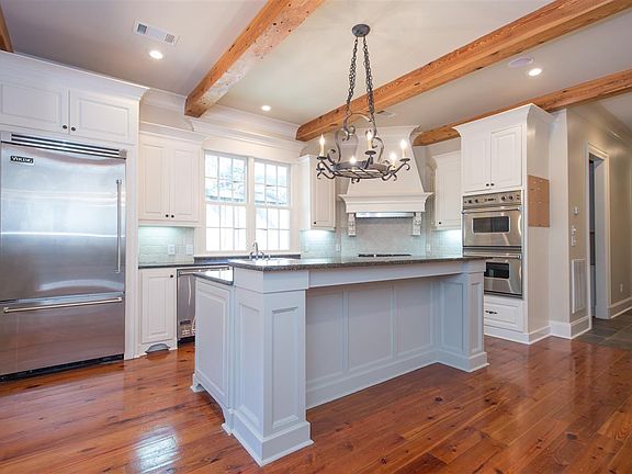 Beautiful brick, fully fenced with stucco wall, brick wall and wood fencing, gated home designed by prominent local architect. Antique heart pine and slate floors, cypress ceiling beams, chef's kitchen with Viking appliances including 6 burner gas stove, warming drawer, ice maker, dishwasher Subzero refrigerator/freezer and large granite breakfast bar. 10 foot ceilings, fireplace and beamed ceiling in great room. Sunroom/loggia includes window wall, wet bar with wine cooler and opens onto pretty back yard. Master suite down with designer bath including glass shower, garden tub, two large vanities with built ins, large closet. Another bedroom suite downstairs, two more bedroom suites up with 9 foot ceilings. New hot water heater June 2017 Travertine marble powder room, large laundry with Bosch washer/dryer to remain. Office with built in desk and cabinets.(powder room there)