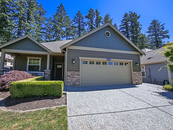 Premier 55+ community of Big Fir! Nature trails & clubhouse. Prime lot on lush greenbelt and creek w/ mtn view. One level home w/ no stairs. Open flr plan w/ vaulted ceilings, great room, granite counters, cherry cabinets, upgraded stnlss applcs & huge pantry. Spacious master suite is 16x16, bath w/dual vanity, walk in shower, large walk in closet w/ built ins...leads to the laundry rm. Covered porch w/gas for BBQ. You will love this well cared for home & low maintenance living. Move in ready!