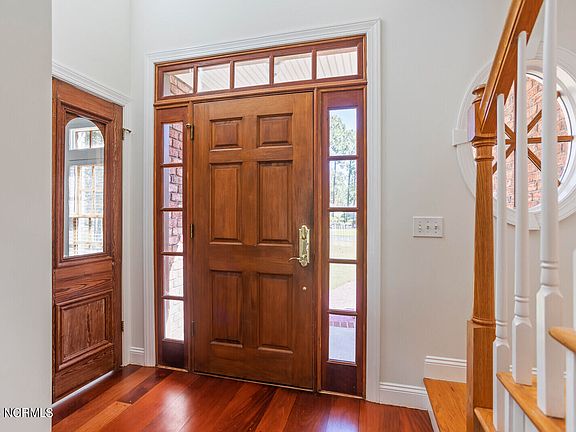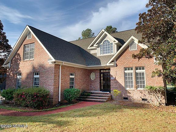 WOW! What a price...under $200 per sq ft for a beautiful custom built brick home with a spectacular backyard on the golf course in Winding River. Property sits high and dry over 1/3 of acre ready for new owners to realize the potential of immediate equity return on investment with a few simple updates. The sellers have REDUCED the price to cover new homeowner's estimated costs to update. Additionally, they have researched suppliers and installers to do it all with 5 easy phone calls to connect and get everything done quickly. Simple selections of countertops, appliances, carpeting, and frameless glass for shower are at the discretion for the new owner to complete personal touches, and final finishes. Home is now better than ever with a N.C. fortified roof (November 2023) & newly refinished wide plank mahogany floors. Freshly painted inside and out. Enjoy the breezes with a stellar southwestern exposure homesite on Carolina National's Egret #2 Golf Course with fairway, pond, and sunset views. The two-story foyer welcomes you to an open floor plan bathed in natural light with floor to ceiling & transom windows. French doors open to the large 12x24 foot deck from both the living room and the primary bedroom. The kitchen has hand painted floor tiles from Portugal, loads of counter space, solid wood cabinets, and pantry. The office or formal dining room features lovely antique double doors. Feel the warmth of the gas fireplace with marble hearth that gently warms the cathedral ceilinged great room and the upstairs rooms. The primary suite and the laundry room are both on the main floor. The En-Suite bath features beautiful Italian Travertine Stone. There are dual vanities and an additional make-up-salon area, whirlpool tub and large walk-in shower. The second level features two large guest bedrooms and full bath, linen closet, and a lovely bonus room with wet bar/sink & additional storage areas. Trane HVAC units with warranties and private well for irrigation.