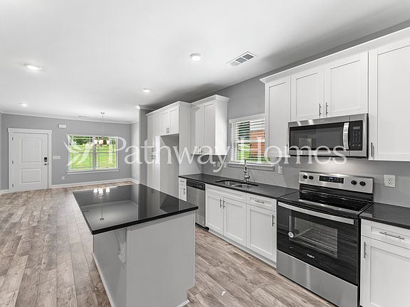 This beautiful 4-bedroom, 2.5-bath home features an open floor plan that seamlessly connects the dining area, kitchen, and great room complete with a cozy fireplace. The kitchen is equipped with white wood cabinetry, granite countertops, a spacious island with a breakfast bar, and ample pantry storage. A convenient half bath is located on the main level. Upstairs, you'll find a generous loft areaperfect for a second living space or home office. The impressive owner's suite boasts a garden tub, custom walk-in shower, dual vanity, and a large walk-in closet. Three additional bedrooms and a full bath complete the second floor. Outside, enjoy a welcoming front porch, an expansive patio ideal for entertaining, a two-car garage, and a wide driveway offering plenty of space for multiple vehicles. *This home does not have an option to purchase. This home can only be rented through Pathway Homes. Pathway Homes will never ask you to wire money or pay with gift cards.
