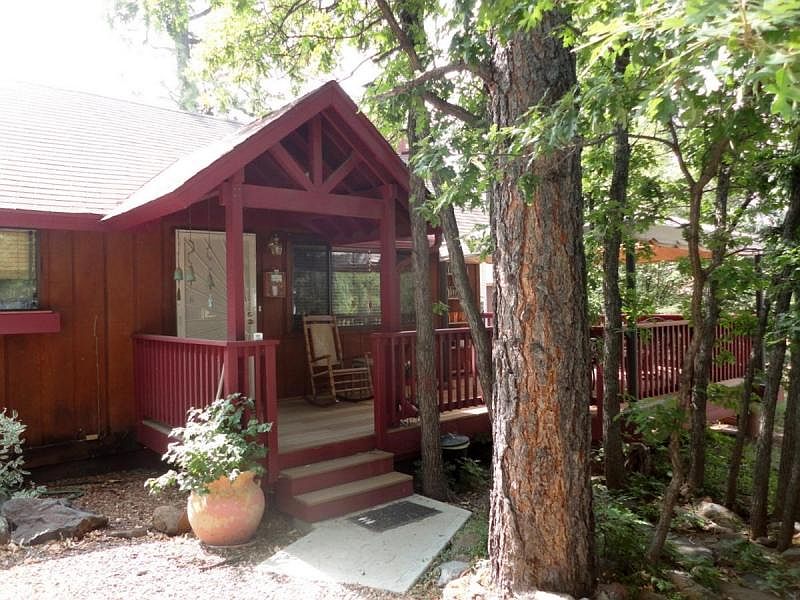 This very nice newly remodeled cabin in the woods won't last long! It has 2 bedrooms and 2 bathrooms. Huge living/great room.The Arizona room has windows overlooking the large heavily treed lot and can be used as a large den or office. It also has a loft perfect for kids to sleep or play in! The wraparound trex deck is perfect for entertaining or relaxing! This home has a seasonal creek in the backyard and is on a quiet cul-de-sac lot with a large driveway. It has been updated throughout and meticulously maintained! New 3 year old roof, updated flooring, fixtures and kitchen, The wood-burning fireplace makes this cabin warm and inviting. Both bedrooms have doors that lead outside with screen door. It also has a drip system outside! This amazing cabin shows pride of ownership and