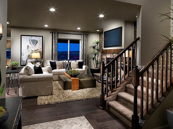 Ready for Immediate Move-In! This incredible two story home sits on a perimeter homesite with western views from the back of the home and sides to a green belt and trail! Upgrades abound including the optional kitchen configuration with morning room and built-in Stainless appliances including a gas cooktop with hood, spice cabinets to the ceiling, granite countertops and massive walk-in pantry. Modern gas fireplace in the gathering room is surrounded by hardwood floors and opens to the rear covered patio. Upstairs you'll find a loft with contemporary open railing, laundry room with cabinets and utility sink, Bedroom 2 with en-suite bathroom and spacious Owners suite with 5 piece bath and walk-in closet with access to the laundry room. Additional highlights include 8ft main level doors, tankless hot water heater and steam humidifier, dual air conditioning and furnace units, additional 220 volt circuits in the garage and basement, modern exterior elevation and front yard landscaping.