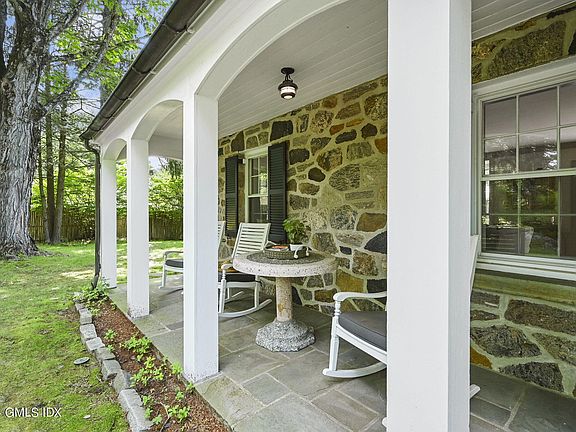 home with inviting front porch, stone terraces and decks located in a peaceful Cos Cob country setting. Gracious center hall entry unfolds into a sunwashed interior enhanced by easy main floor flow, exquisite architectural details and wood floors. Spacious living room with fireplace, bookcases and terrace access; formal dining room with bay window, 2013 renovated kitchen, breakfast room with deck, adjacent family room and full bath encompass the main level. Second floor offers serene bedrooms including primary suite with fireplace, bath and fitted walk-in closet, deck overlooking the lovely backyard. With lower level mudroom, access to attached two-car garage, laundry and storage.