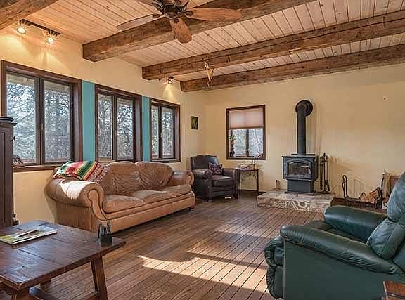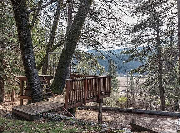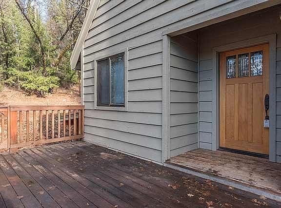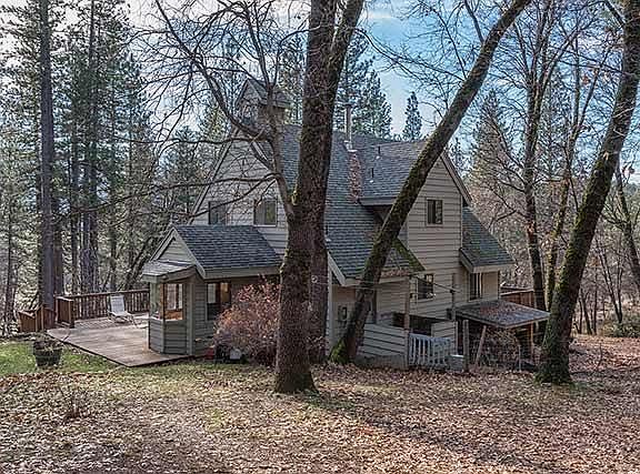 Welcome home to 3 stories of cozy living on 1.56 acres. Enjoy amazing views from this 1,838 square foot main house and a convenient floor plan, including 3 bedrooms upstairs, 1 bedroom downstairs and a free standing wood stove, oak flooring, hand cut beams accenting the tongue and groove ceiling, separate laundry, and wrap around deck. The breakfast nook welcomes sunshine, wildlife, oaks and pines through the large windows. Approx 1000sf one bedroom attached apartment.