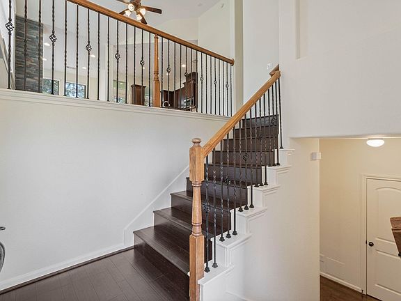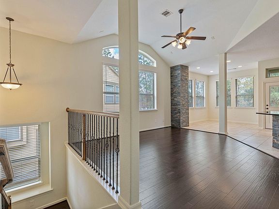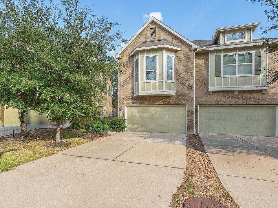 Beautiful move in ready townhome located in the Woodforest community. The upstairs offers an open living, dining and kitchen area great for families and entertaining with a balcony off the kitchen overlooking back yard and greenbelt. Brand new washer, dryer, microwave and refrigerator included. Large primary bedroom is also located upstairs. Primary bathroom has separate shower, large soaking tub and walk in closet. Split floor plan has 2 secondary bedrooms and bathroom downstairs with a flex/game room which has access to fully fenced back yard and quite private patio. Walking distance to Stewart Elementary, Harvest Market and area shops. Woodforest community offers a Resort -style pool, community center , parks and miles of walking and biking trails. Yard maintenance is included in rent. Available immediately.
