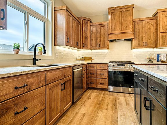 3 bedroom, 2 bath slab on grade executive home with an oversized 3-stall garage. Home has a grand feeling with 9' ceilings, gas fireplace with side built-in cabinets, LVT flooring throughout common areas, stained premium alder cabinetry throughout, recessed lights in common areas and tray-vault in Great Room. Primary bedroom is spacious, 13' x 15' with private bathroom that features cultured marble countertops. Kitchen features 8' island with seating on both sides, large linear pantry with adjustable shelving, granite countertops, soft close drawers, and built-in wood exhaust hood above range. Garage is heated, insulated and provides additional storage over garage, inground sprinkler system.
