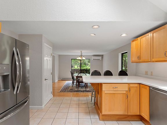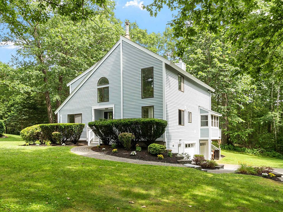 Welcome to the desirable Woodland Pond Neighborhood! This beautiful contemporary home features vaulted ceilings and an open floor plan. Hardwood stairs/halls updated tiled kitchen, hardwood & vaulted ceilings in the dining area, the fireplaced living room has hardwood floors & sliders to an expansive deck, 4 mini-splits for AC, a 1st floor office/bedroom and 1st level 3/4 bath plus laundry room. The 2nd level has a primary bedroom suite with full bath. Plus 2 other generous sized bedrooms (3-bedroom septic system) and a full bath to service them. Updated carpets in all 2nd level bedrooms, The lower level has a partially finished walk-out basement room & a two car garage with freshly epoxied floor. Stone lined hot water tank, up-dated boiler, Cedar clapboards & all Azek exterior trim, maintenance-free decking, paver walkway, granite steps, & a very nicely landscaped lot. Desirable Pinkerton Academy school district. This property won't last long! Quick closing is possible.