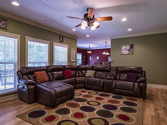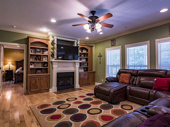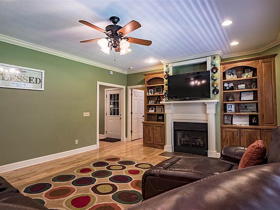 - LIVING ROOM DESC: Fireplace, Crown Mold, Wood Floor, Ceiling Fan, Recessed Lighting, Built Ins