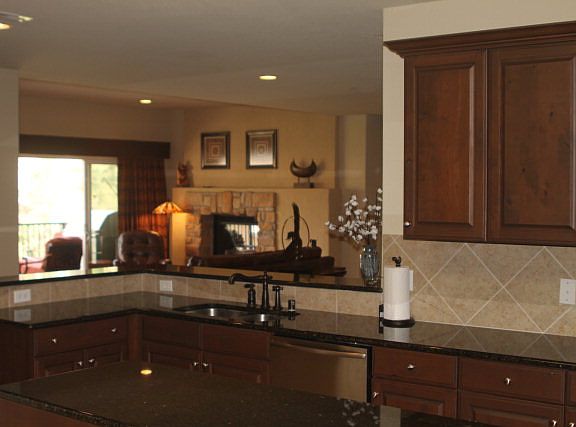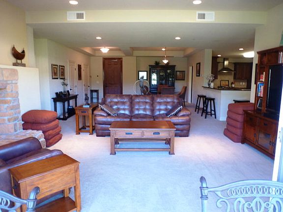 Huge Price Reduction: Luxury Condo at Ruidoso River Crossing. River and Mountain views. A very classy. High ceilings, open floor plan, large rooms, tall wooden doors, custom paint with lush carpet and tile floors. Bedroom suites and living room with rock fireplace have mt views. Large modern kitchen with stainless steel appliance, granite counter tops, huge pantry, beautiful cabinetry/ soft shut drawers. Tiled, covered patios with roll out awning. Huge jetted tub and low step shower with two side fireplace in main suite. Very special home for those that like quality. 2 Central AC and gas heat.Two parking spaces in cover and locked garage. 2413 sq ft. Storage cages too. Club/Fitness Room.