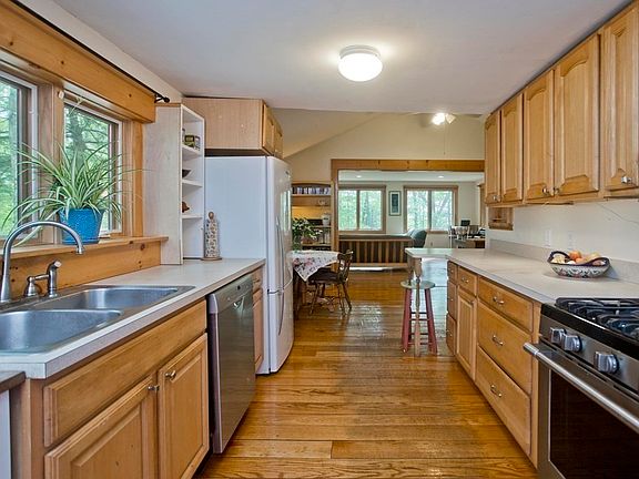 Charming, remodeled house on a private and serene hillside humming with wildlife. Wendell State Forest, Lake Wyola and Leverett Co-op are all close by. Recent home improvements include two additions, partially finished-basement, updated electrical system and a low-maintenance composite deck. Enter through the bright mudroom into the open-concept living space. Hardwood floors, large windows & a cozy wood stove create a comfortable living area with beautiful natural light. Wake up in the primary bedroom and enjoy your morning libation on the private back deck overlooking the gardens. Other features include another bedroom on the main level, two finished bonus rooms in the walkout basement & broadband service ideal for a remote office. A detached barn with separate driveway, chicken coop and extensive garden beds add up to a homesteaders’ dream. Known for its cultural vibrancy. Wendell is conveniently located near Amherst, Greenfield and Route 2 (for a direct shot to Boston).