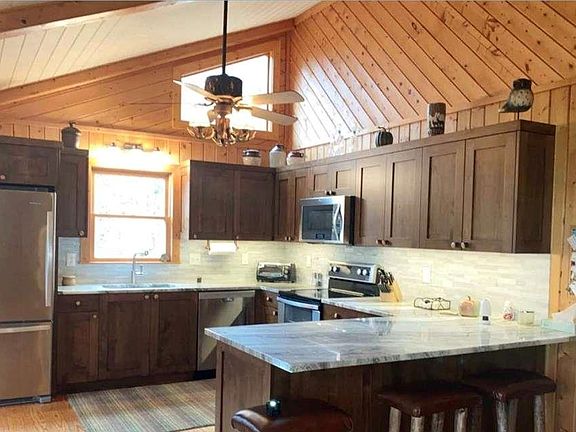 Corner fireplaceFull finished basementCreek frontageScreened porchRustic and refreshing cabinOpen kitchenLarge entertainment area