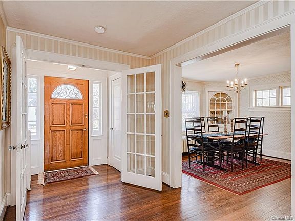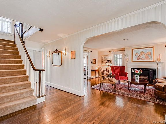 Classic 1930s center hall Colonial just minutes from West Hartford Center. This 4 BR/2.1 Bath home has over 2,000 SF of living space. The home features a gracious foyer that opens to a formal living room with wood burning fireplace, bay window and French doors that lead to a covered porch for outdoor living and entertaining. Also off the living room is a bright and cozy den with built ins, perfect for a home office, play area or sunny sitting room. The home features a formal dining room with a charming corner hutch, bay window and door that leads to the porte cochere. The kitchen is large with lots of counter space and ample cabinetry, including a pull out table/island for eating or additional prep space. When not in use, it folds up and stores away. Upstairs is a master suite with 2 closets and a private, full bath with jetted soaking tub. In addition, there are 3 guest rooms and another full bath. All bedrooms have hardwood floors under the wall to wall carpet. There is central air on the 2nd floor only. At the back of the house is a 2 car garage and level upper yard, perfect for a garden or play area. Conveniently located near shopping, restaurants and public transportation. Walkable to West Hartford Center and Blue Back Square. Come check out this charming home and all it has to offer