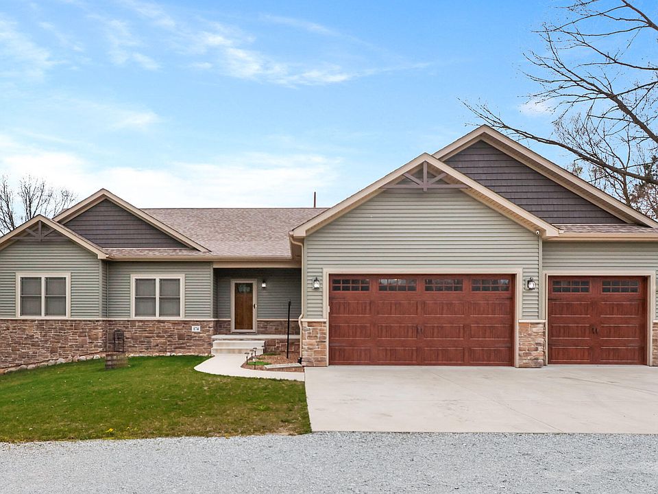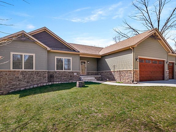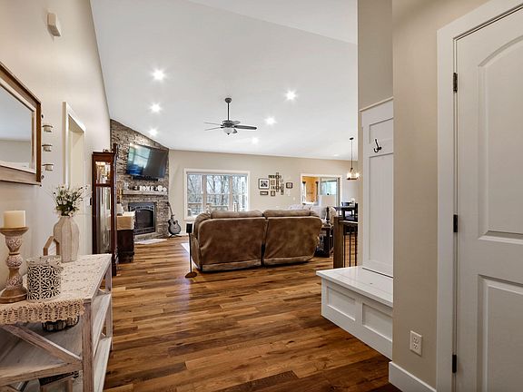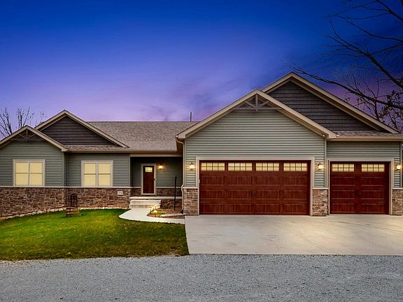 Nestled on 7 sprawling acres of picturesque landscape, this breathtaking custom hillside ranch was crafted just four years ago. As you step inside the foyer, you are welcomed by an airy open-concept living room accentuated by vaulted ceilings that elevate the spaciousness and natural light pouring through the expansive windows. The custom fireplace is a focal point of warmth in the room, creating an ambiance of relaxation and leisure. The culinary enthusiast will find their dreams fulfilled in the kitchen where granite counters and stainless steel appliances compliment the rustic custom soft-close cabinets. A vast island takes center stage perfect for meal prepping or gathering, while the inviting dining area adds a more formal touch. Seamlessly attached to the kitchen is the seasons room which is ideal for savoring morning coffee and enjoying the views. Retreat to the spacious primary suite featuring tray ceilings and mood lighting creating a calming atmosphere. The ensuite bathroom boasts a double vanity, separate shower, clawfoot tub and a massive walk-in closet. Across the hall you will discover two sizeable rooms along with another full bath. Finishing off this level is a convenient mudroom/laundry with built in shelving and sink, access to the 3 car garage with extra storage and a guest bath. Descending to the walk-out basement which is partially finished promises endless potential and opportunity. It also displays a bedroom, bathroom, storm shelter and tons of storage space with built-in shelving. Step outside to your personal oasis complete with heated pool, tanning deck, patio with seating surrounding a firepit and an upper deck for panoramic views. A storage shed and garden area cater to outdoor needs with room available for a pole barn to accommodate hobbies. Seeking a peaceful escape or a unique setting for entertaining this hillside ranch offers luxury living redefined.