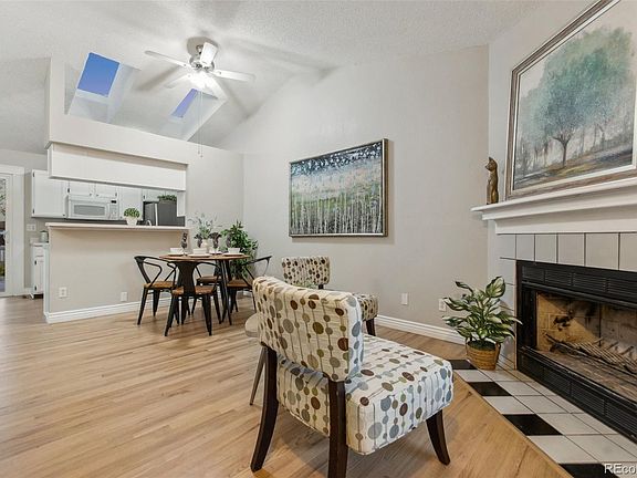 This charming and bright three-bedroom, two-bath home sits on a corner lot in Founders Village, a sought-after neighborhood in Castle Rock. The home features vaulted ceilings, creating an open and spacious feel. The living room, with its inviting fireplace, offers a cozy place to unwind. The galley kitchen, brightened by skylights, provides an abundance of natural light. Upstairs, two bedrooms and a 1.75 bath ensure ample living space. The basement enhances the home's appeal with a media room, a third bedroom with an attached full bath, and a laundry area. The backyard is beautifully designed with a custom water feature, perfect for outdoor enjoyment and relaxation. Move-in ready, the home includes several updates, blending modern conveniences with classic charm. Founders Village is known for its community amenities, including parks, trails, and shopping, making it a perfect location for families. This home’s thoughtful layout and prime location offer a wonderful opportunity for comfortable and stylish living in a vibrant and welcoming neighborhood.