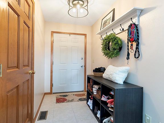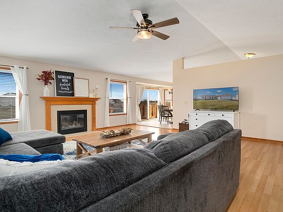 This charming ranch-style home features 3 bedrooms and 3 baths, offering a warm welcome with its tiled entryway. The spacious living room is highlighted by vaulted ceilings and a cozy gas fireplace, complemented by natural light streaming in through two large windows. The kitchen provides ample space for dining with its generous layout and convenient sliding doors leading to a deck. Outside, a custom-built seating area on the deck overlooks the backyard, which is perfect for gatherings around the fire pit. The large master bedroom includes a private ensuite bath and a walk-in closet for added convenience. Additionally, the main floor boasts a convenient laundry room. Downstairs, a finished lower level offers extra space for various activities, complete with a rec-room, bathroom and workout room. With a 2.5 car attached garage, this home combines comfort and practicality seamlessly. New roof 2018.