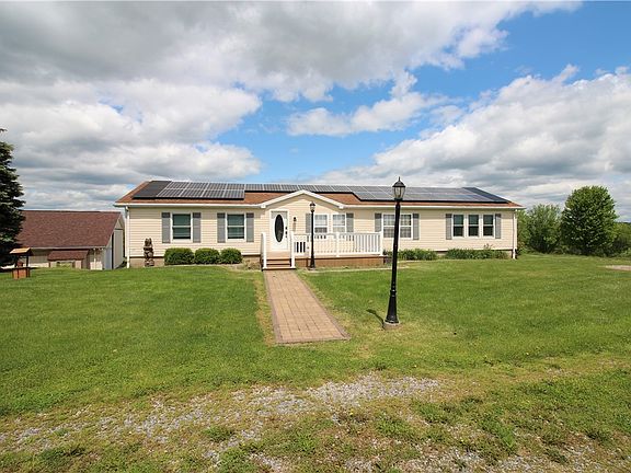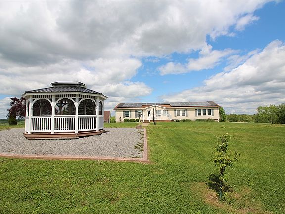Large Manufactured Home on full foundation w/ 6.78 acres offers small farmette country living. Open floor plan & numerous kitchen, dining, laundry, principal bath & bedroom built-ins provide plenty of space for relaxing & storage. 3'X6' kitchen island. 1st floor laundry. 8 ceiling fans. Extra large 4th br w/fireplace & walk-in closet or may be used as a flex/game rm. 2 basement stairwells, one w/ a chair lift. Full basement w/ overized 3-car garage & storage/work area. Whole house water filtration system. Completely owned Roof Solar Panels. New Anderson windows in much of house. New Screened Gazebo 10'X14'. New Curbing around landscape beds. New Composite Front Deck 16'X12'. New Composite Back Deck 24'X12' + addl 14'X6' section to 5' wide steps to yard. New auto retractable awning 12'X12'. Detached Pole Barn 48'X44' w/ regular man-door & 2 each roll up doors 8'wX7'h & 4 each sliding doors 12' extra tall X 11' wide to accommodate large vehicles or RV; w/ 2 full length cement runs.
