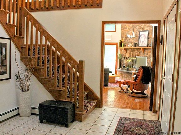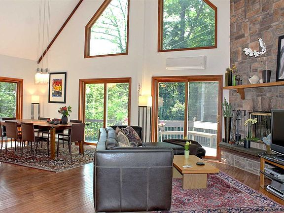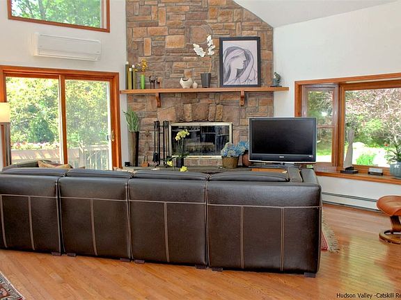The perfect country retreat! Total privacy just 5 miles to Uptown Kingston with plenty of space for all your guests! This fabulous contemporary home is nestled on 6 + acres, bordering 130 acres of Wild State Forest, with soaring ceilings, open floor plan, and beautiful natural light. Entertaining will be a breeze with a great kitchen open to the living area and 3 sets of over-sized sliders that allow the party to spill out onto the expansive deck. In the colder months there is plenty of room for all to gather in front of the captivating stone fireplace. Two main level suites, as well as a first-floor utility room, mud room, and access from the attached garage make this multi-level home feel like easy one level living. There is a second-floor suite as well, complete with a large cedar closet, bathroom, and a nursery. The walk out basement boasts a family room, workshop, wine cellar, and plenty of storage space. A fourth guest suite could be easily acheived with the addition of a bathroom in the basement. This is a must see! No sculptures convey.