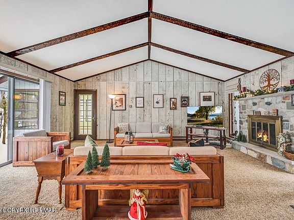 - Description: Cathedral ceiling, stone woodburning fireplace, opens to sunroom